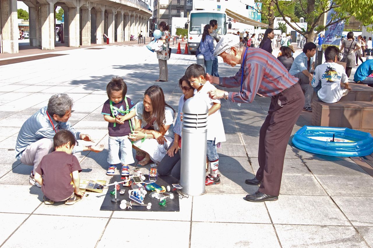 2日目は雨降りのつもりでテントを開けたが降る気配はない、それどころか日差しが見えてきた。モジュールも発電は順調。しかし、天気が悪いと思ってか、観客の出足はよくない。11時ごろになっても前日より少ない。ようやく午後になって、少し増えた。日本大通りの方はどうかと偵察に行ってみると、こちらは混雑で人ごみをかき分けて通るほどであった。やはりメインの通りは違うんだとひがむ気持ちが出かかった。