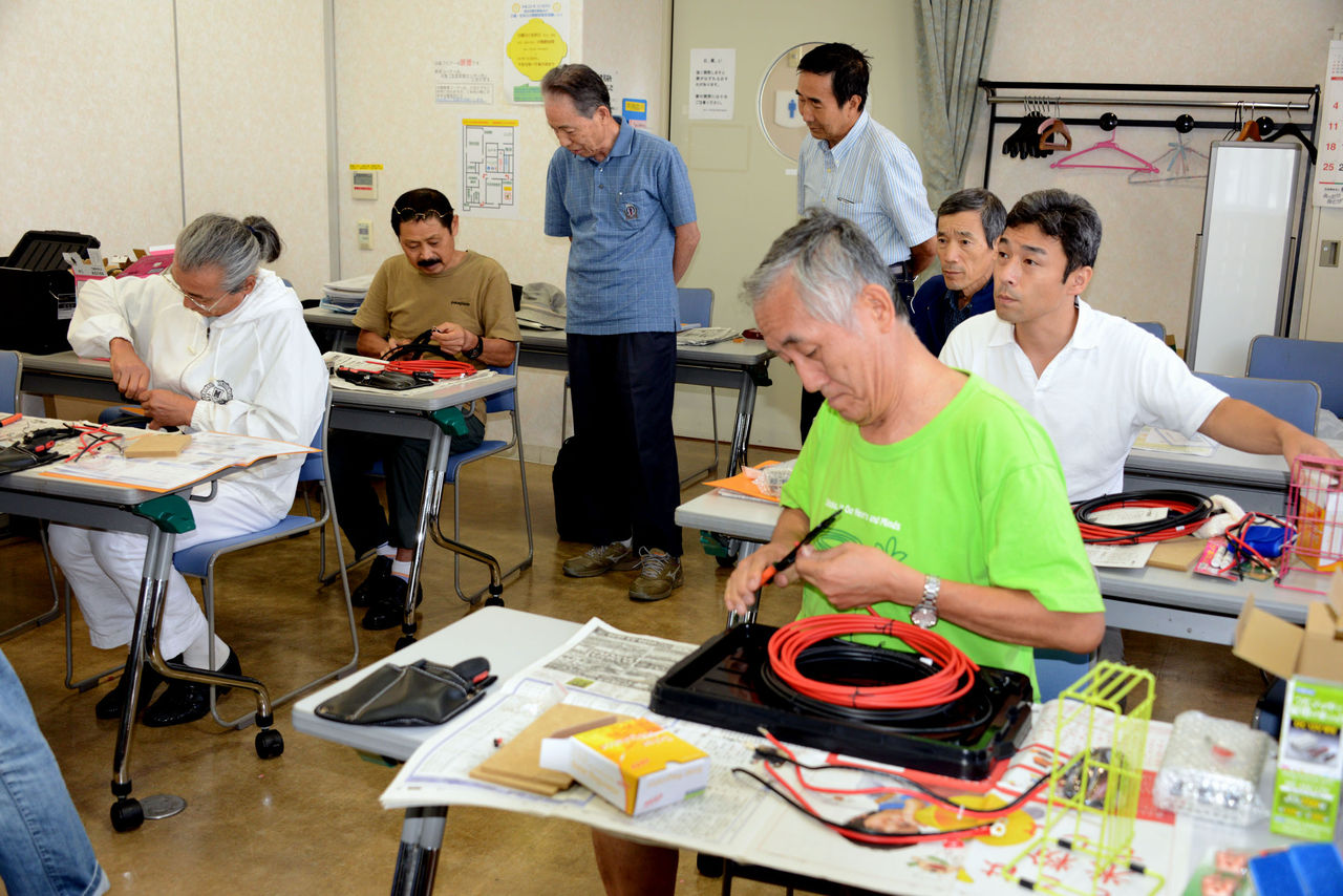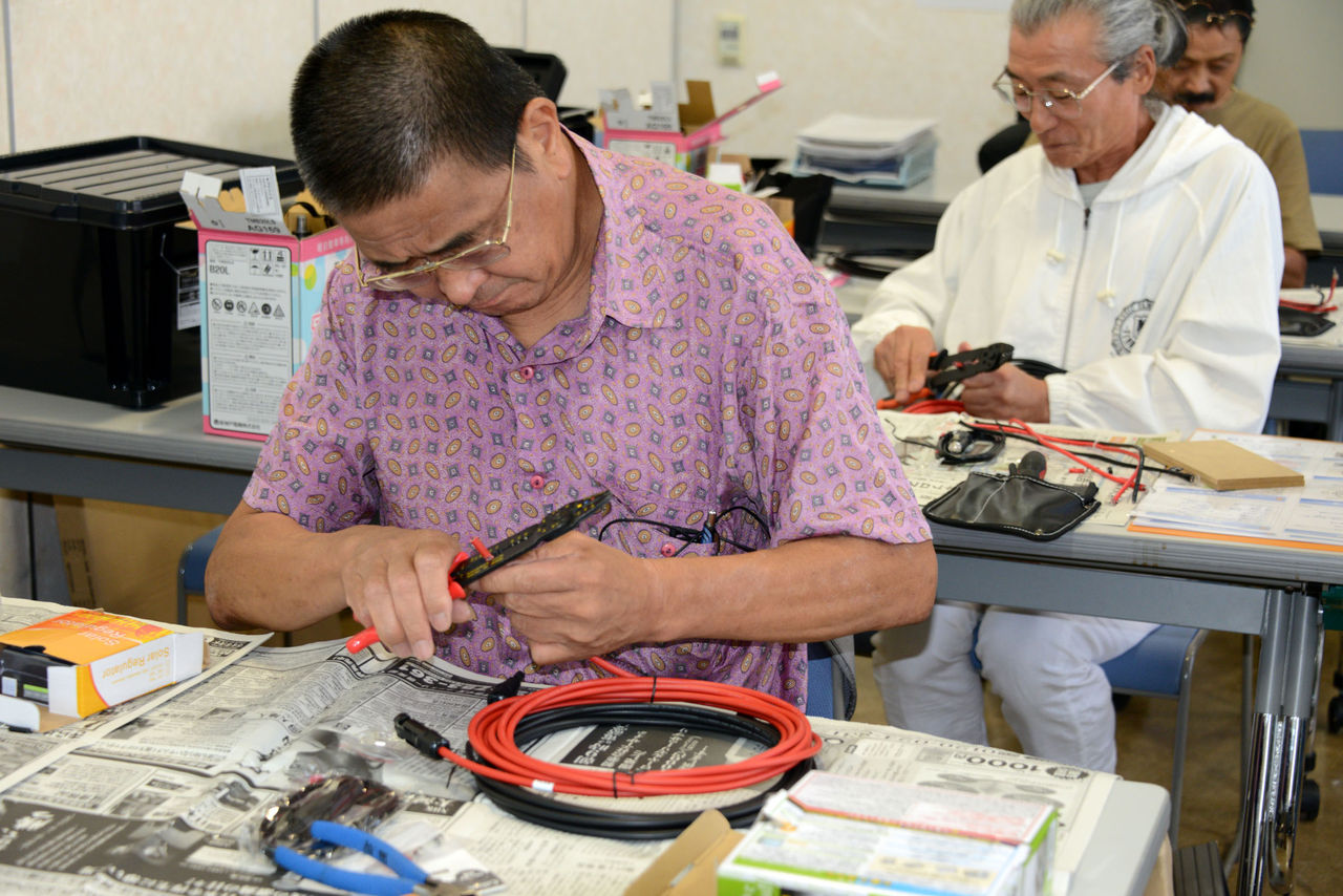 指示された長さに電線を切って、先端に接続用の端子を付けるという作業。「先端を10mm、被覆を剥いてください」という指示に簡単そうでだが手こずっている。ハンダ付けではない、端子の圧着はさらに苦労していた。意外に器用さ、不器用さが出てしまう。補助員の協力でなんとかクリアーしていた。