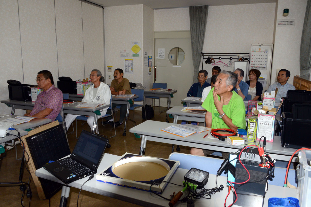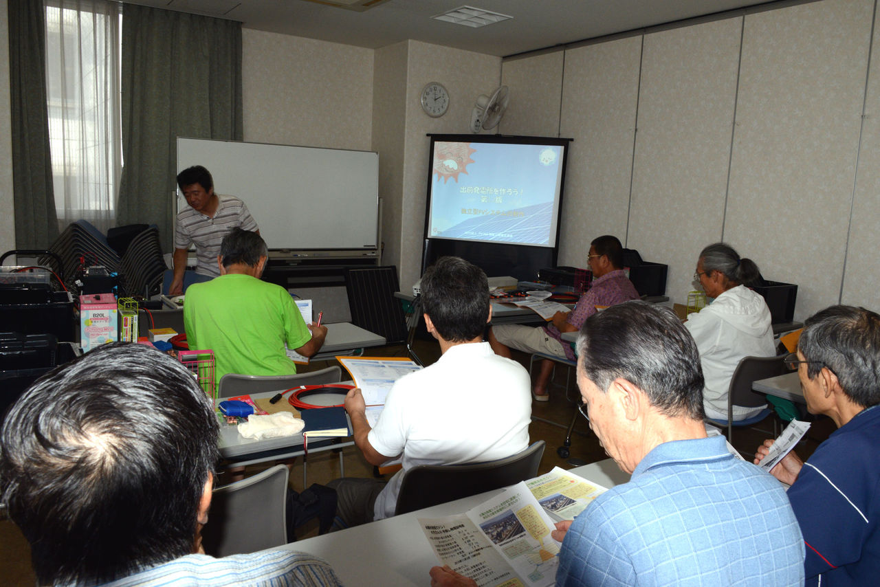 午後2時より開始。前半約1時間はレクチャーで、電気取り扱いの知識、太陽光発電の基本、独立型システムについて、神奈川交流会世話人の古峰聖治氏の講義があった。