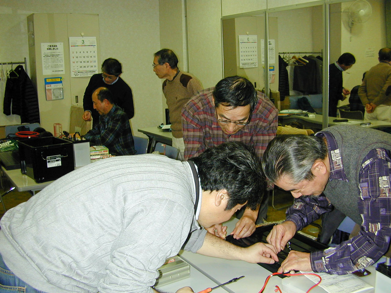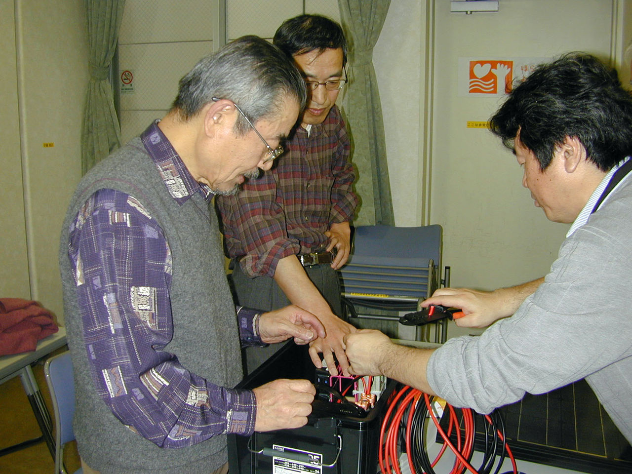 「次に先端を10ミリぐらい被覆を剥いてください」「見学の方も手伝ってもらってもいいです」 10ミリといっても、みな2センチぐらい剥いている。目分量で作業することが苦手のようだ。1組の方は、かなり手慣れた様子で、作業が的確で比較的早い。