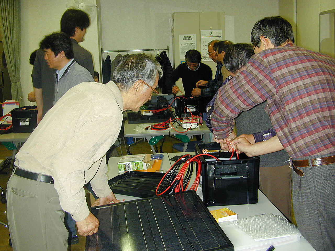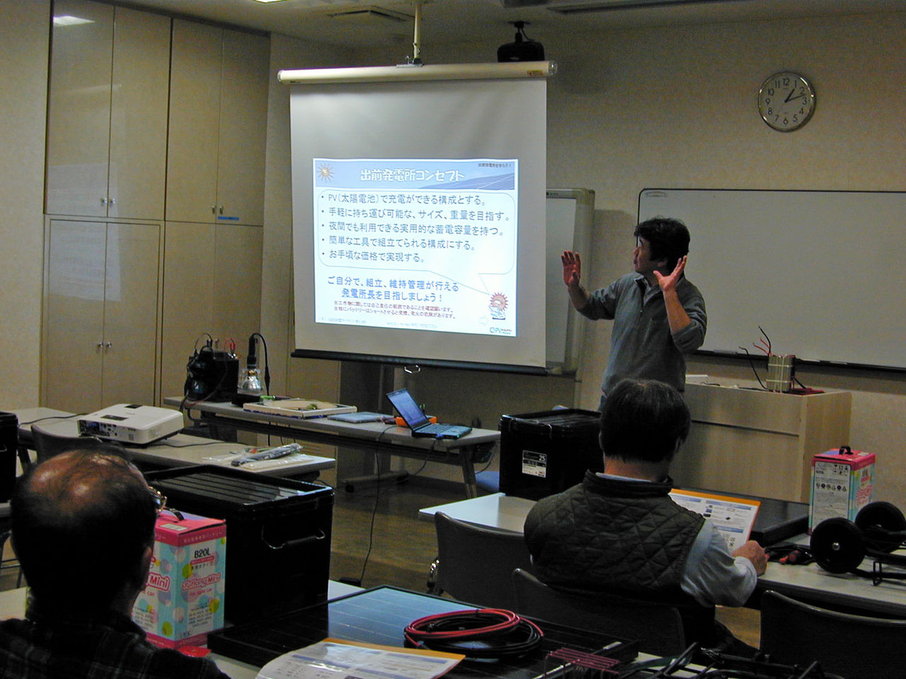 午後1時から、代表のあいさつの後、講師役の古峰さんが1時間ほどレクチャーで、地球温暖化と再生可能エネルギーについて、電気の基本的知識、そして、今回製作の独立型太陽光発電システムについての説明を行った。