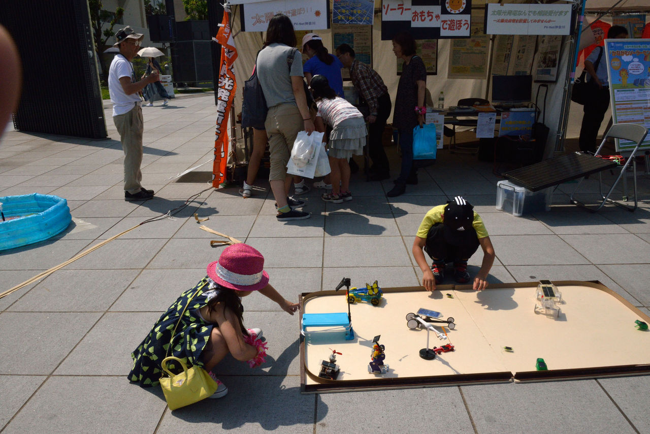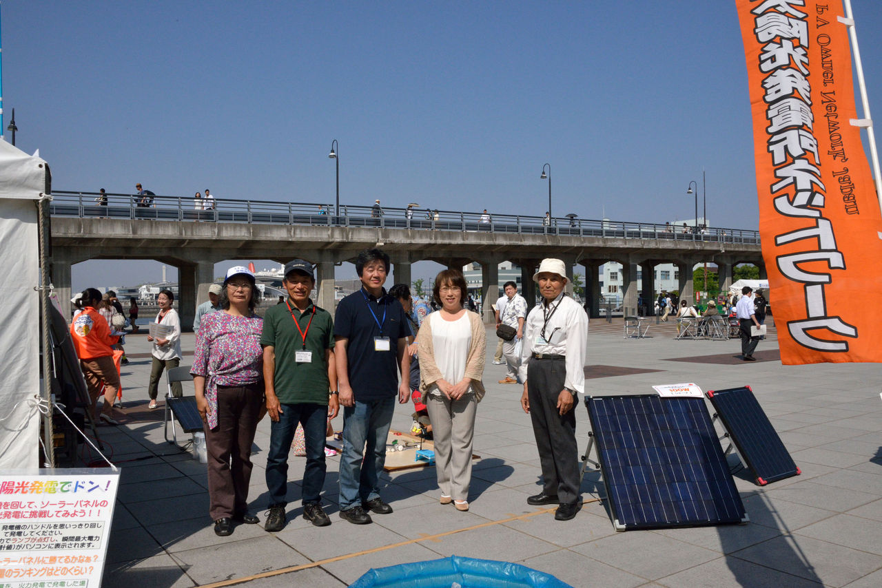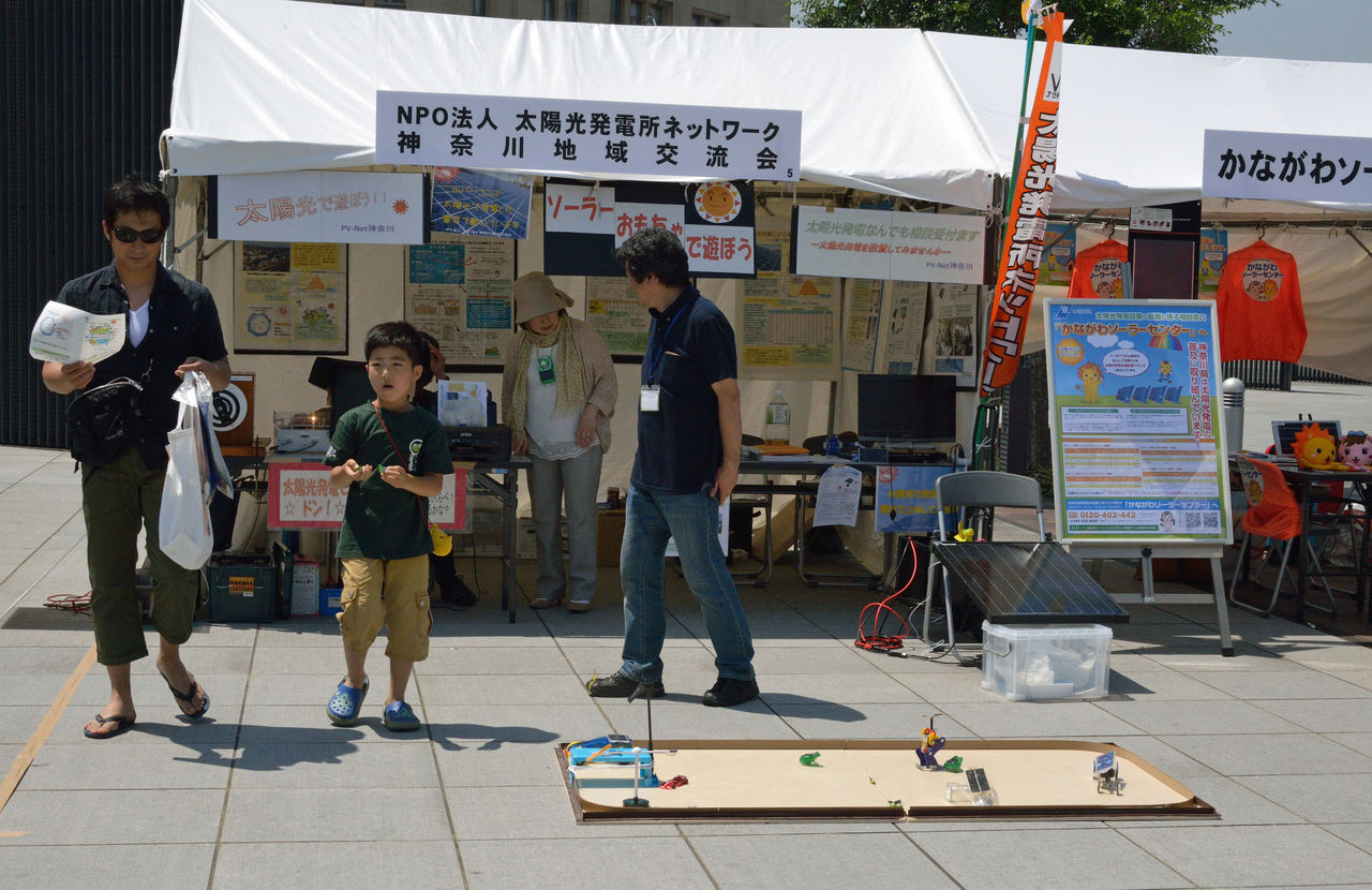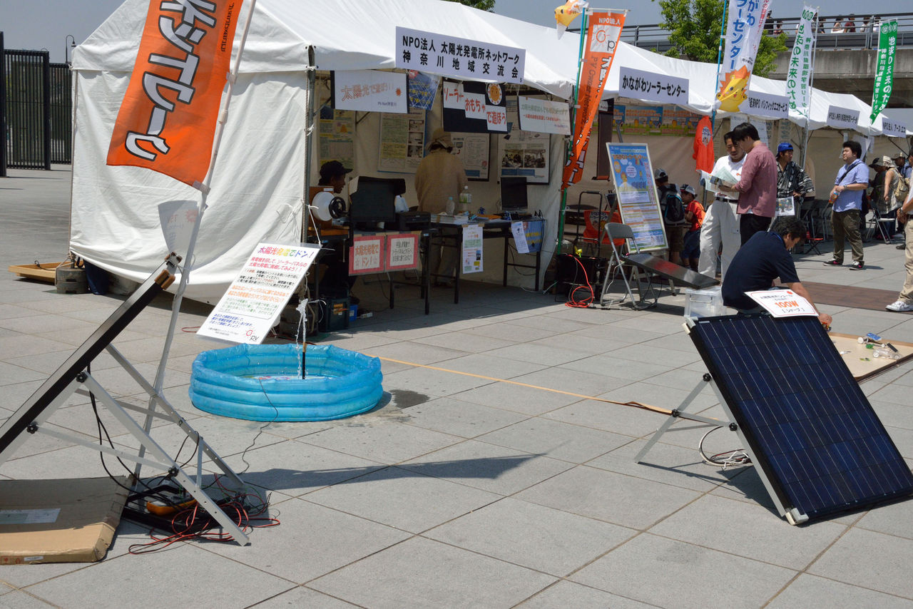 一生懸命市民に太陽エネルギーの利用について、訴えようと意気込んだものの、観衆の関心は低く、テントの中の説明パネルを見てくれる人はほとんどいない。子供連れが、おもちゃのコーナーで遊んでくれるか、一部の人が「太陽光発電でドン」のところで、手回し発電機で挑戦して、飴をもらっていくかである。