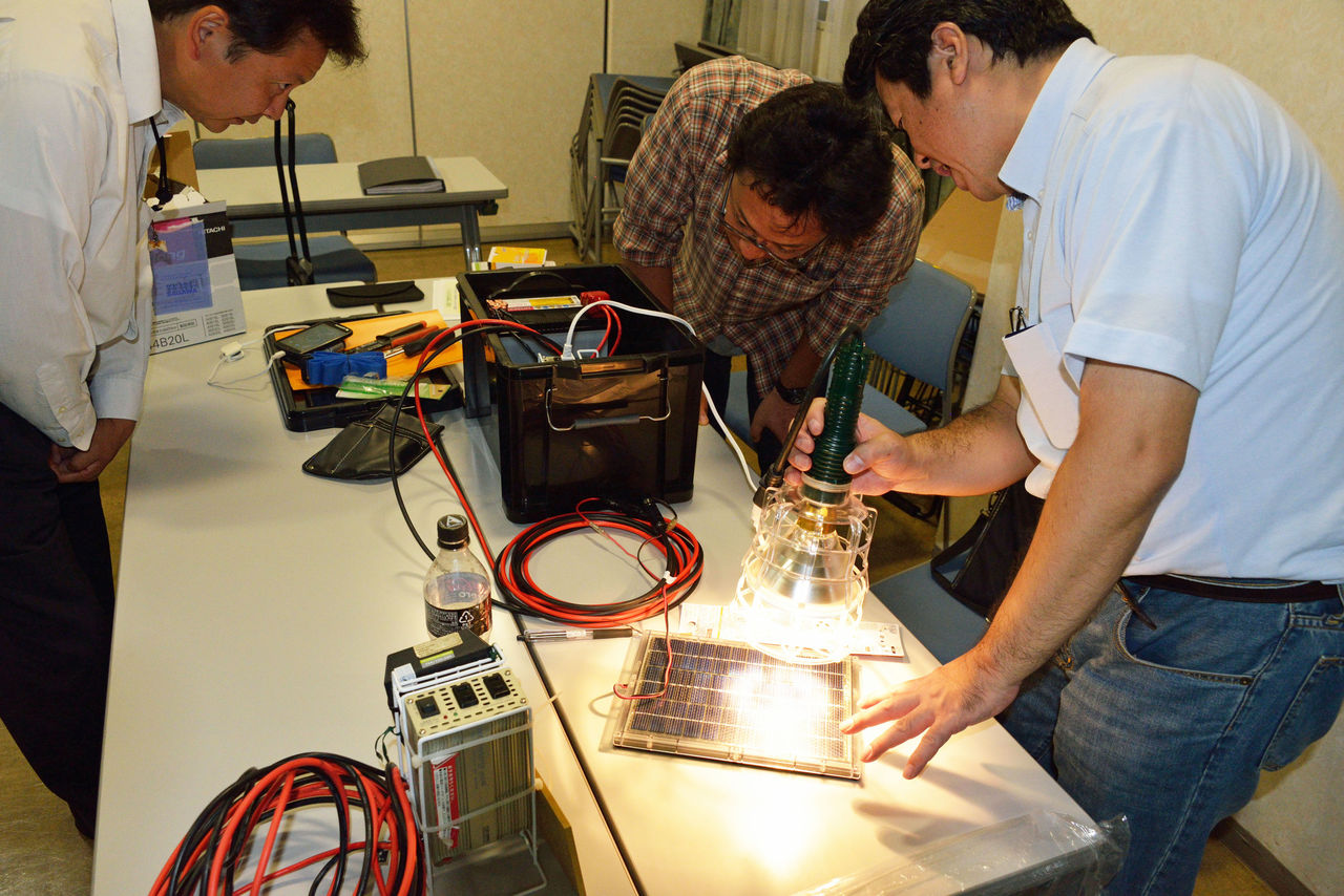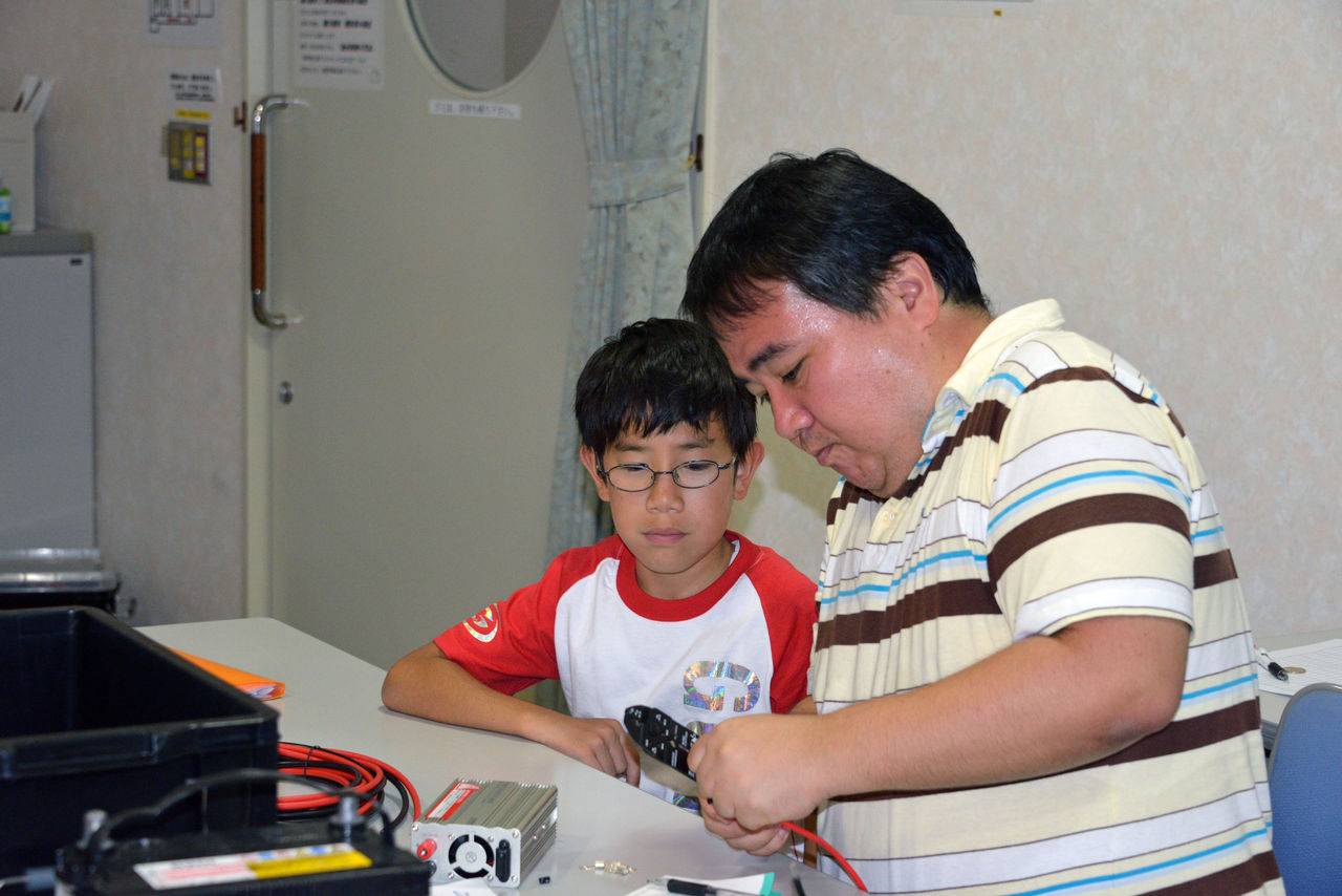 「角で締めるとうまく止まります」コツがあるのだが、最初はつかめない。組み立ての最後はバッテリーにつなぎ、通電テストをして完成。約2時間40分ぐらいで組み上げることができた。それぞれの太陽電池パネルに接続して感触を確かめていた。