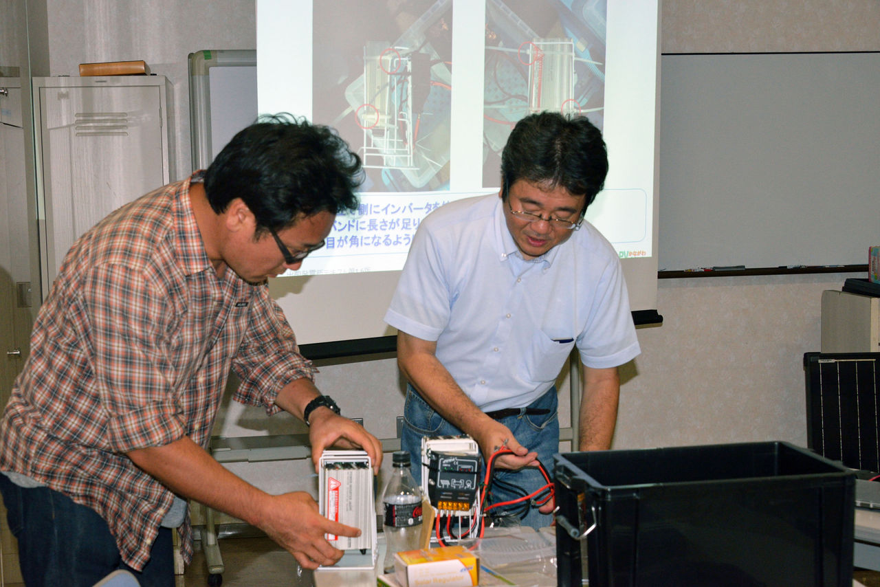 1時から講師役の古峰さんから、簡単なPV-Netの活動紹介、続いて、電気の基礎知識やバッテリーについての講義が行われた。5分間ほどの休憩の後、独立型発電システムの組立実習に入った。