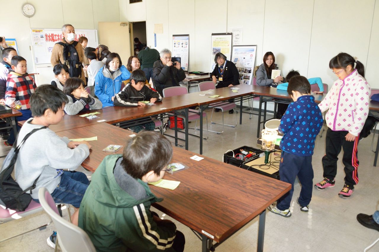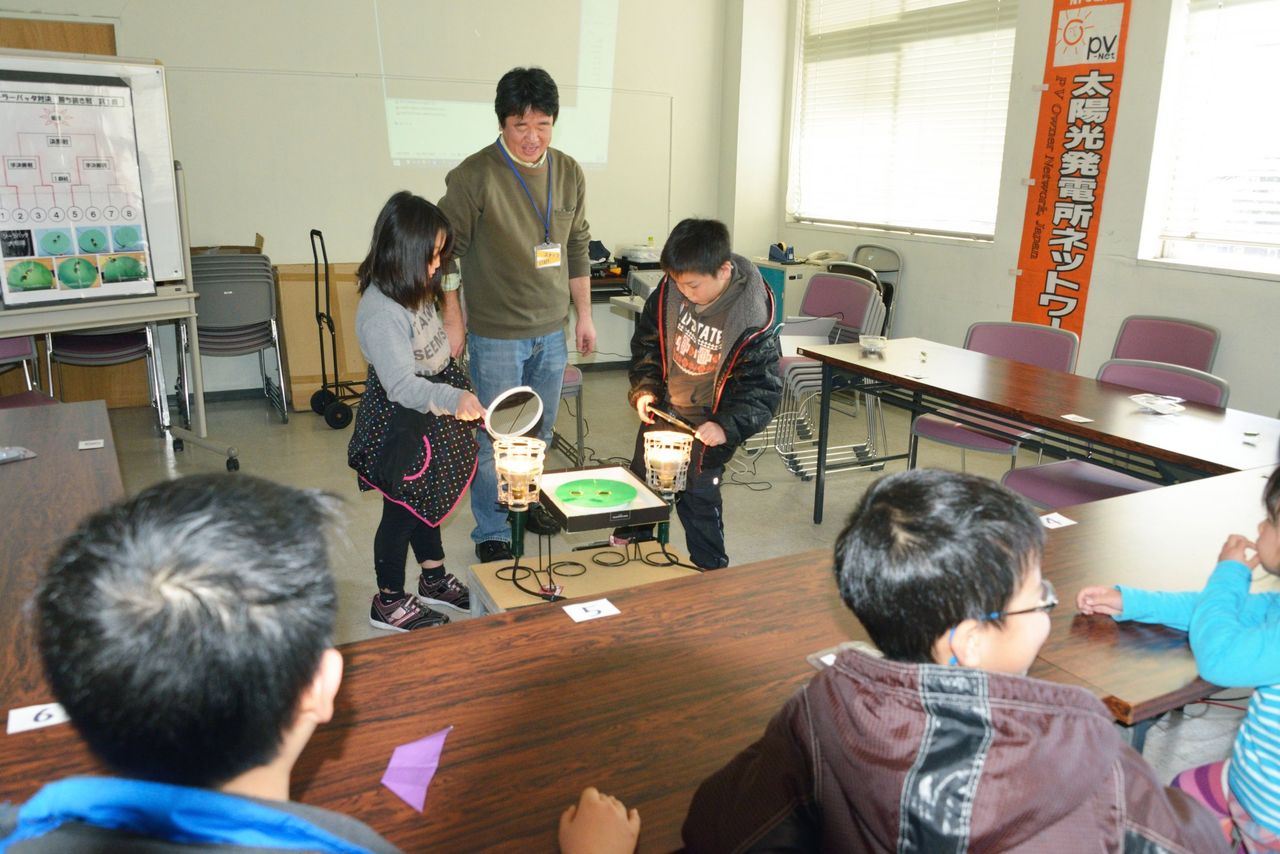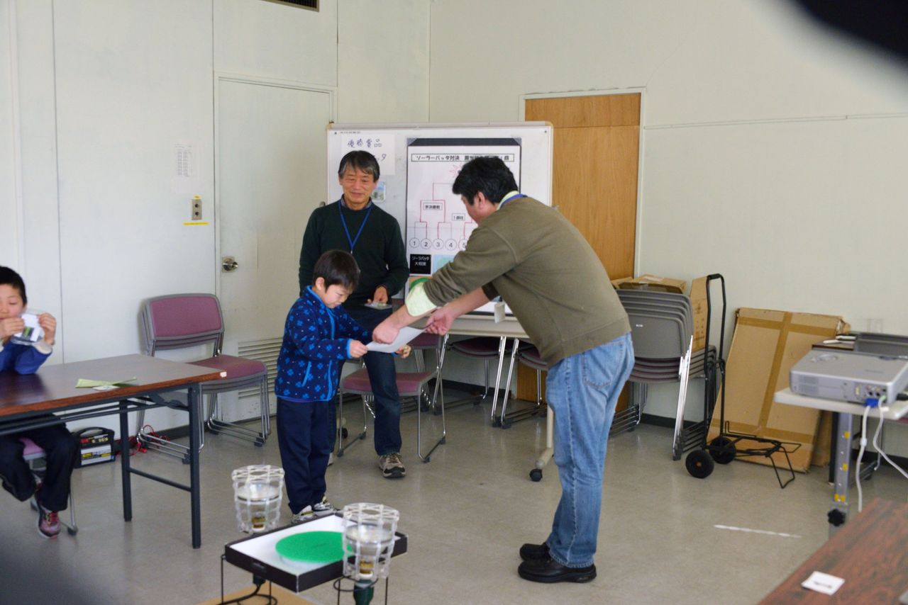 参加者にはそれぞれにソーラーバッタを用意し、最初に太陽光発電についてと、バッタに鏡の反射で光の当て方を解説した。(これは、子供たちには鏡で光の当て方が難しいという前回の反省から付け加えてものである)次に、一組ごとに練習を一回してもらってから本番の対戦を行った。1回戦、準決勝、決勝と勝ち進み、優勝者には賞状と、賞品にソーラーバッタ一個をあげた。