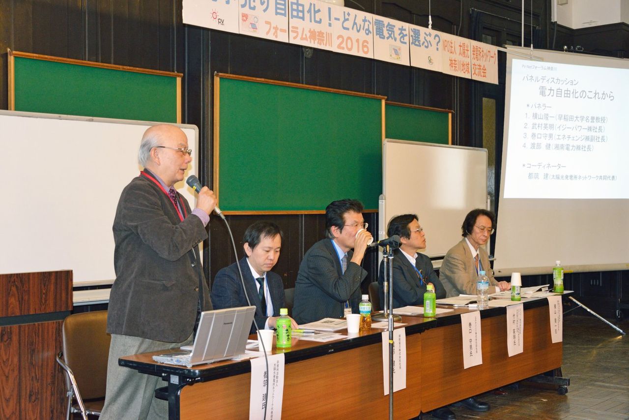 そのあと、2019年問題(2009年11月から余剰電力買取制度による、48円で10年間の買取は2019年で終了する)を踏まえての、今回の電力自由化をどうとらえるか、太陽光発電、再生可能エネルギーの立場でどう考えるか、電力購入の選択で注意すべきことは、どんな電力を選ぶべきか、などについて話し合われた。