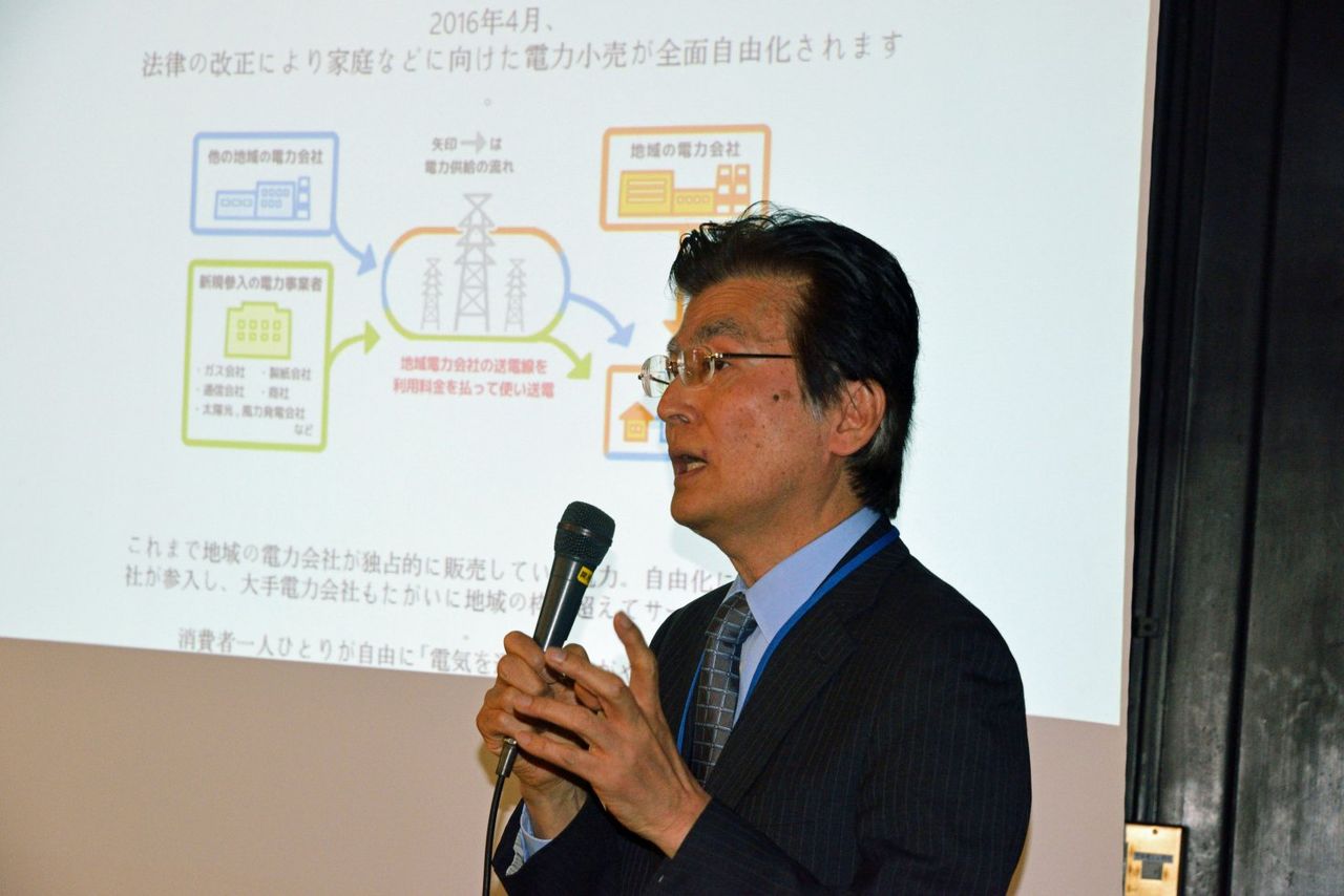 基調講演、横山氏のお話はかなり多い資料に基づいて詳細な説明があり、参加者からも、電力自由化の詳しい様子が聞けたと好評であった。