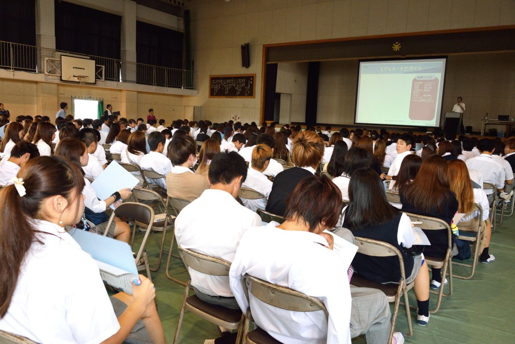 授業は、3~4時限を利用、体育館に椅子をセット、1年生8クラス282名を集合させて、大型スクリーンにパワーポイントの資料を投影しながら、説明を進めた。