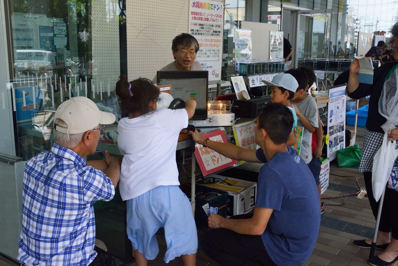 ソーラーバッタの組み立て教室は、11時と、14時に二回実施。1回12名、市があらかじめ募集をしておいてくれた。対象は小学生で、低学年は父母等の同伴とした。ここで作ったバッタは持ち帰ることができる。費用は平塚市が補助してくれた。