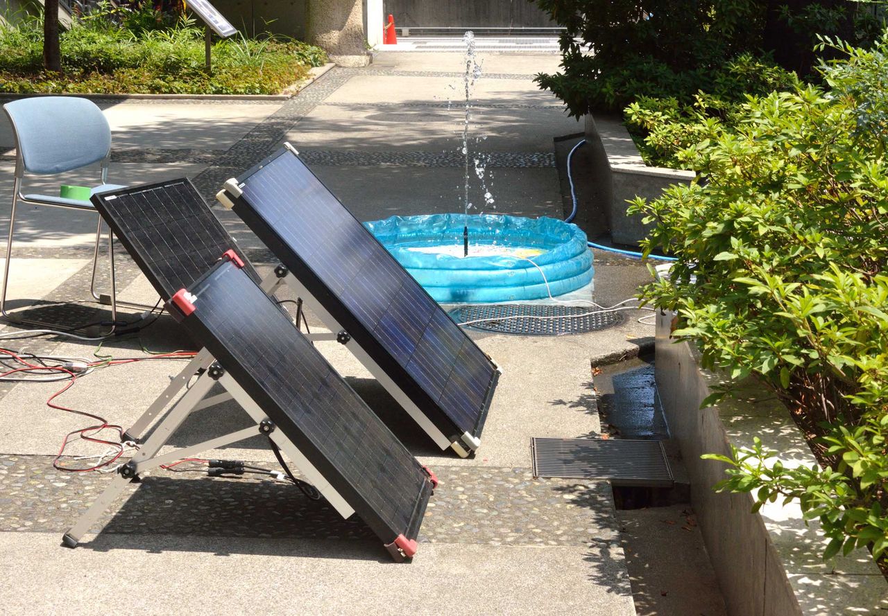 ソーラーパネルは順調に発電。噴水も高く吹き上げている