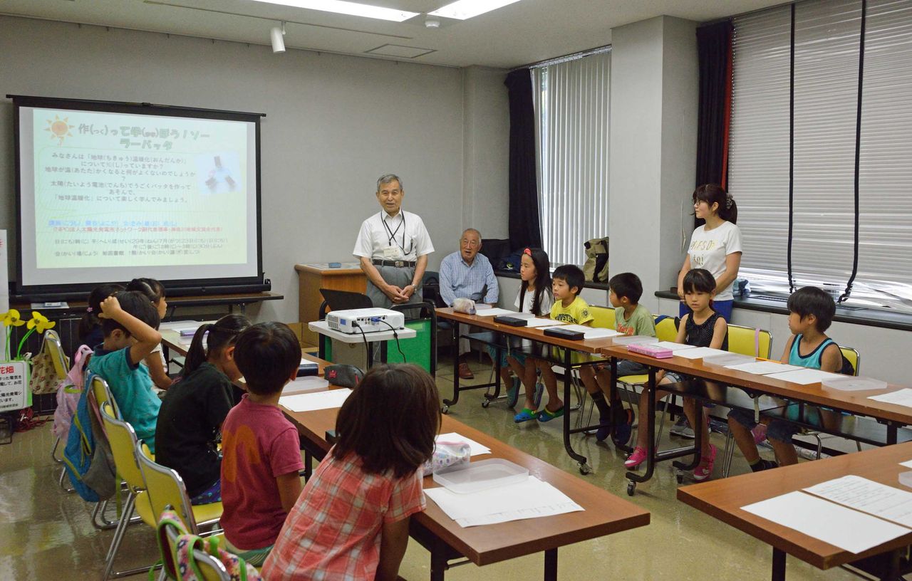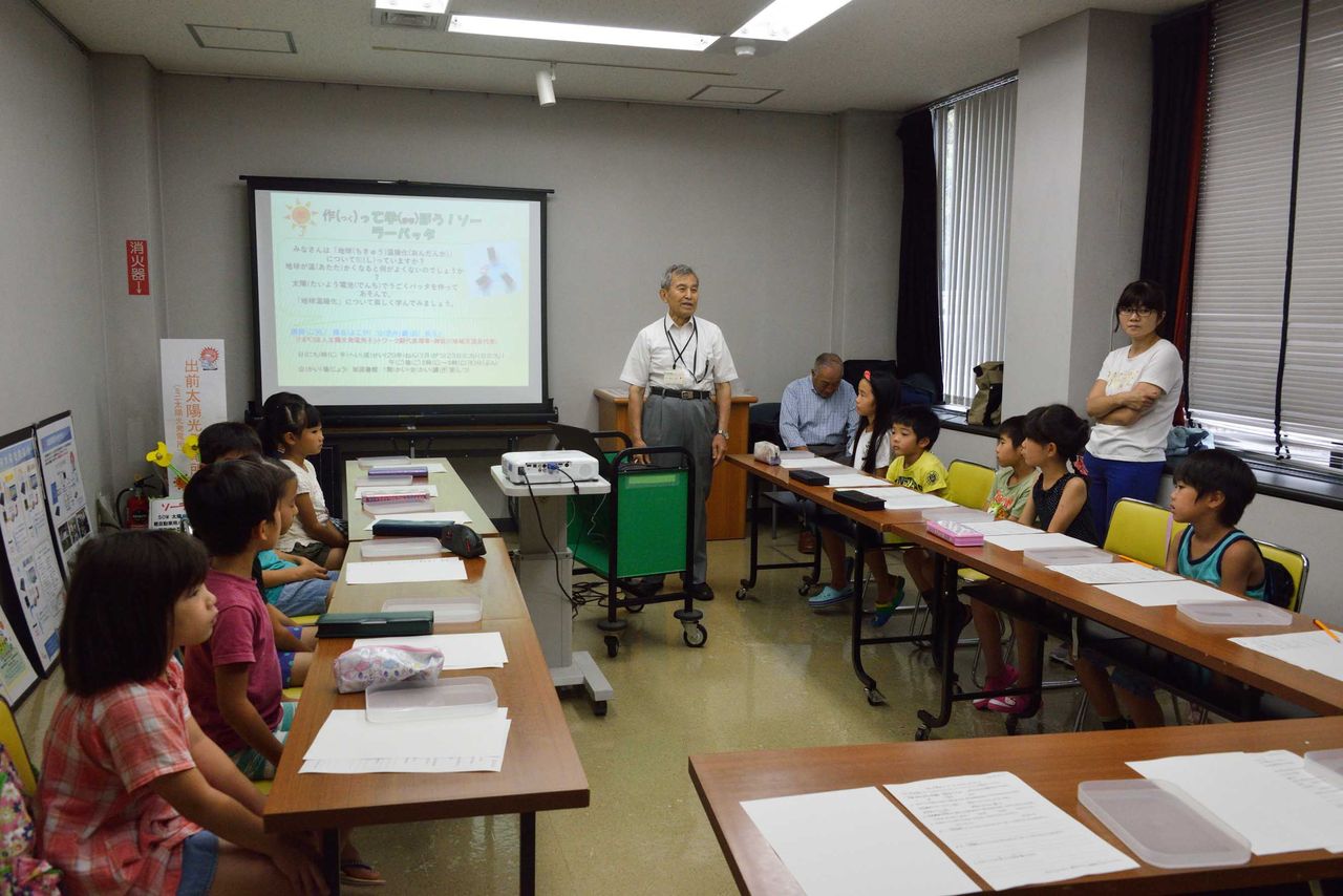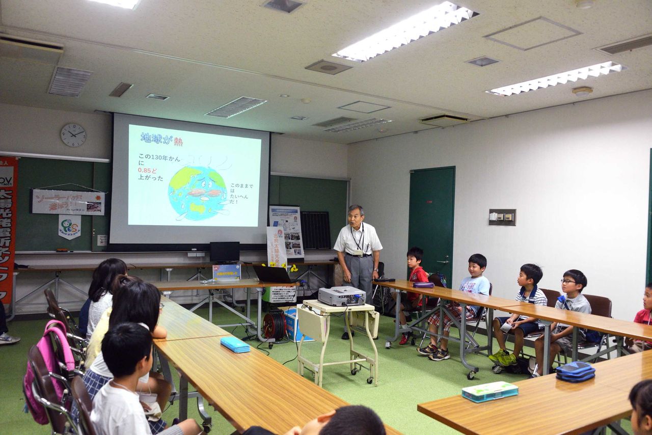 最初レクチャーで地球温暖化、太陽光発電等について、プロジェクターを使って、説明をする。