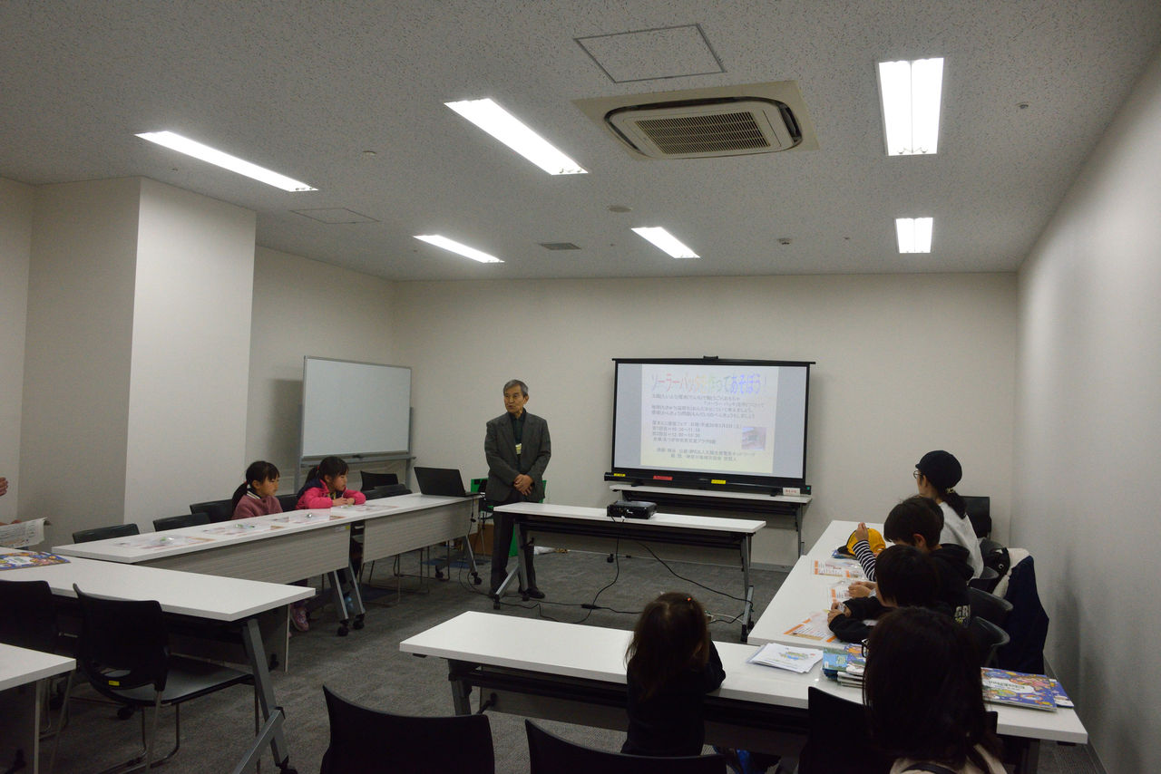 結果は午前の部には4名ほど。午後の部は2名だった。最初は地球温暖化防止についてのレクチャーがあり、そのあとソーラーバッタの組み立て作業が行われた。