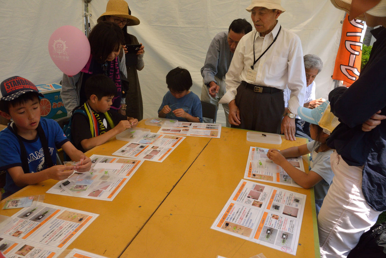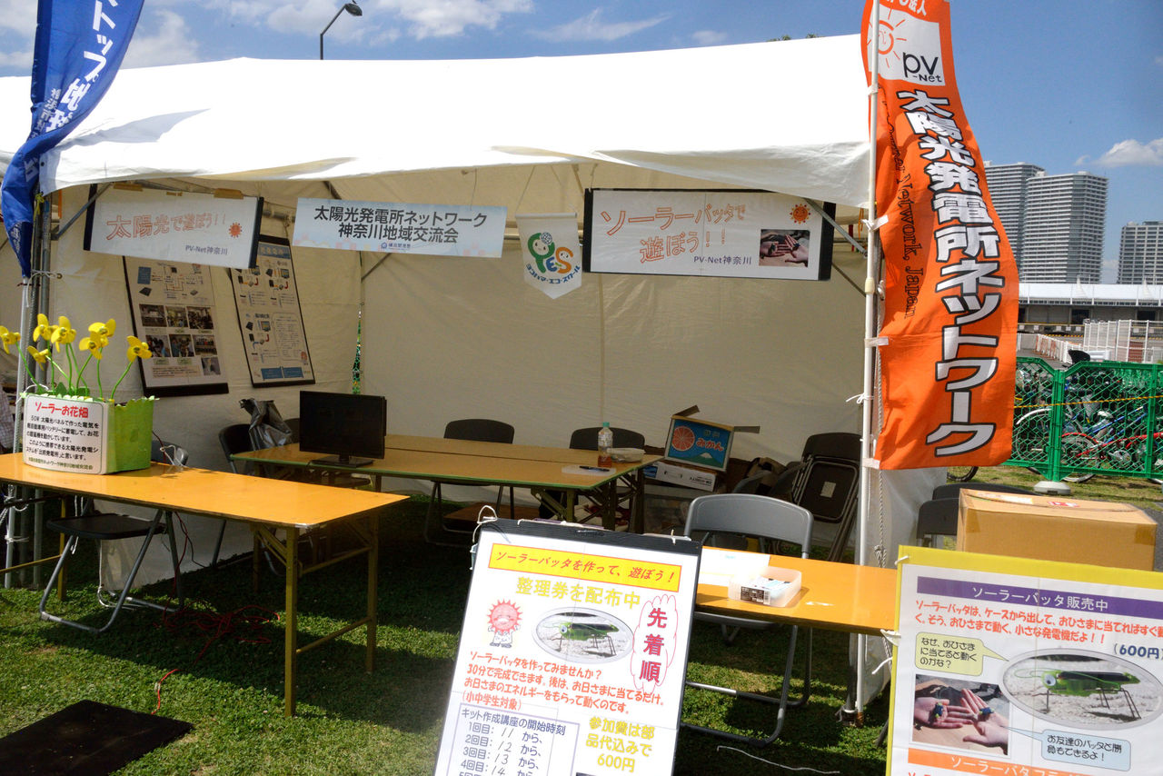 2日は前日にもまして好天気、11時からのバッタ工作教室も予約満杯。一回、小学生8名の定員で順調な滑り出し。簡単な太陽電池の話をして、製作時間はおよそ20分間。完成して、テントの外で、太陽光に当てて、元気よく動くことを確かめる。みな笑顔になる。