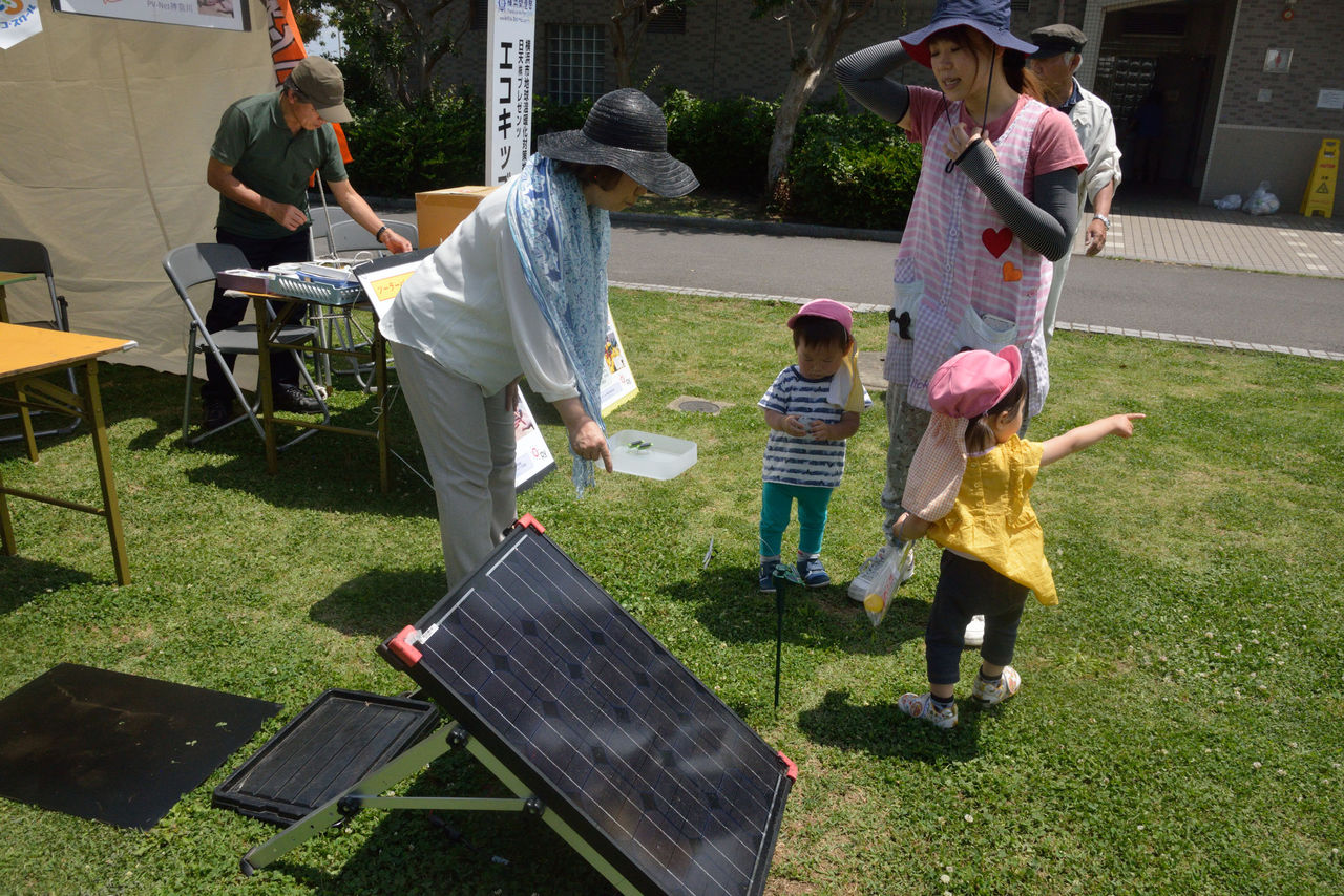 開港祭・2日目ソーラーバッタの工作教室、「地球温暖化を救うのはあなたたち子どもです、だから子供が大好きです」