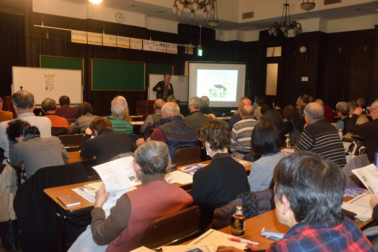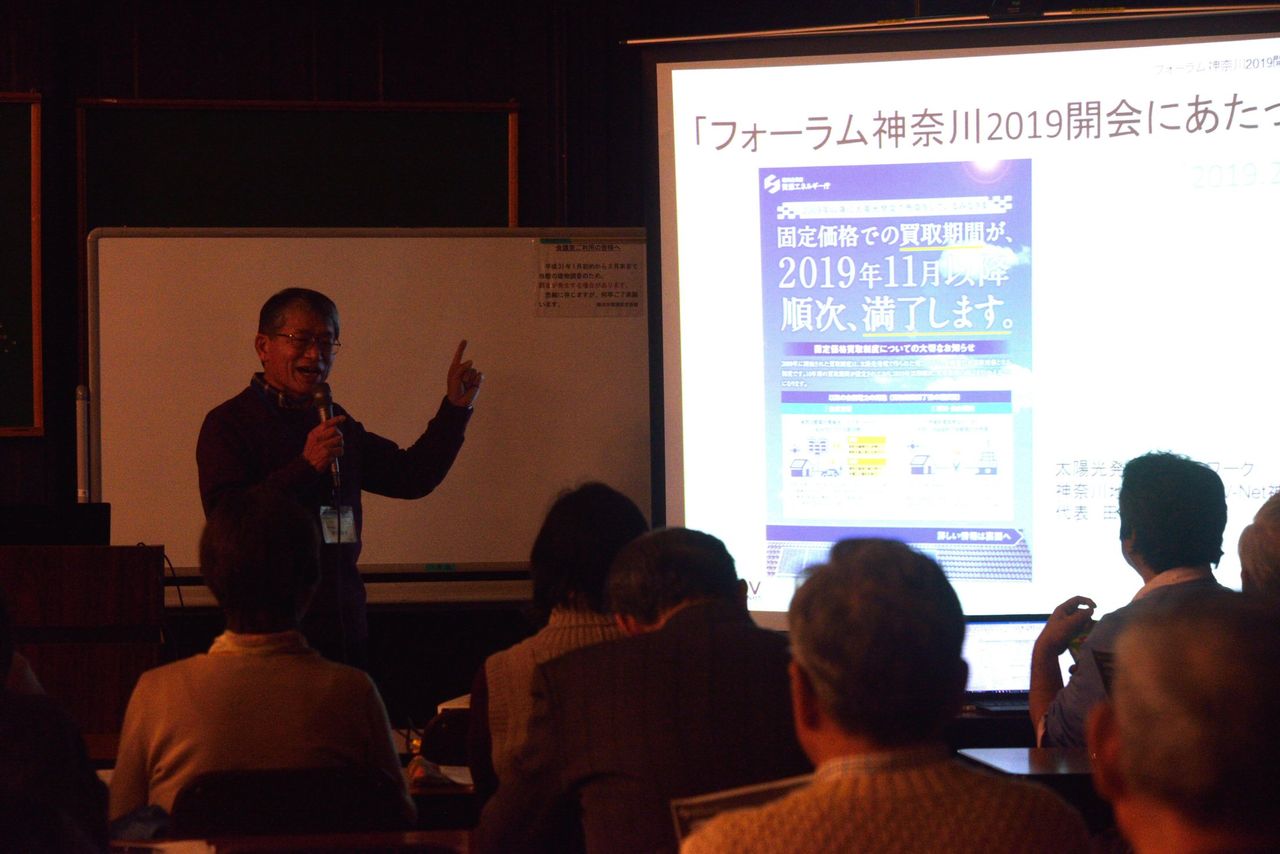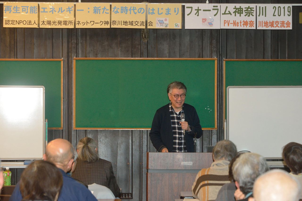 昨年のテーマは2019年問題を踏まえ「太陽光発電:売る時代から使う時代へ」とした。今年はその延長線上で「再生可能エネルギー・新たな時代のはじまり」としたのである。参加者は65人で、会員以外の関心ある一般市民が、静岡や千葉など遠くからも参加者があった。