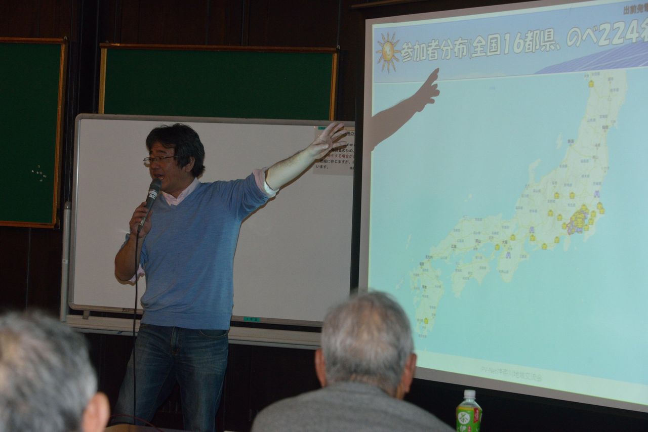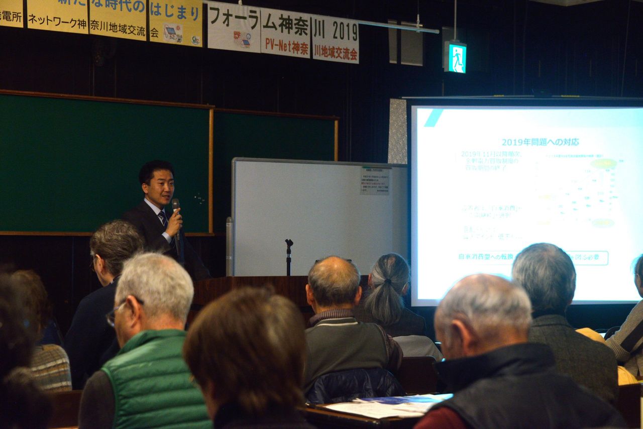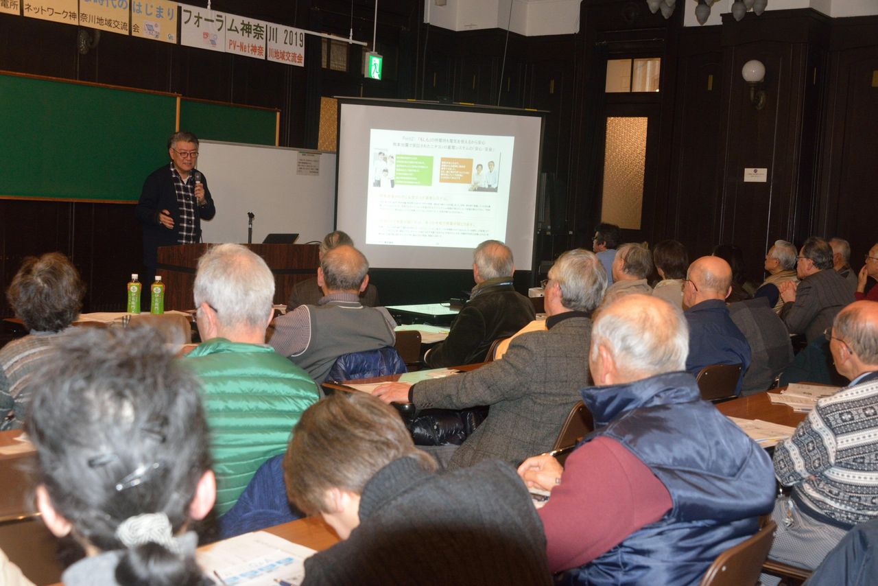 昨年のテーマは2019年問題を踏まえ「太陽光発電:売る時代から使う時代へ」とした。今年はその延長線上で「再生可能エネルギー・新たな時代のはじまり」としたのである。参加者は65人で、会員以外の関心ある一般市民が、静岡や千葉など遠くからも参加者があった。