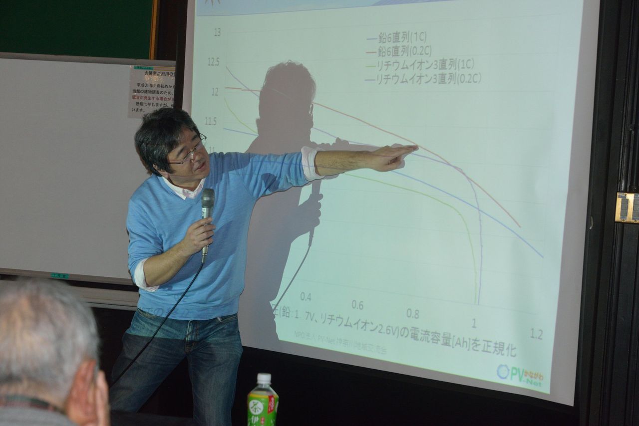 講演1:県・エネルギー課の上平義樹氏まず、福島原発事故、東日本大震災の影響、かながわスマートエネルギー構想、神奈川県再生可能エネルギーの導入等の促進に関する条例の成立、かながわスマートエネルギー計画(5つの基本政策)、太陽光発電の普及拡大(神奈川県内の状況)、神奈川ソーラーバンクシステム、「屋根貸し」太陽光発電事業、薄膜太陽電池普及拡大プロジェクト、ソーラーシェアリングの導入促進、自家消費型太陽光発電等導入補助、蓄電池導入補助(今年度の緊急対応)、エネルギー自立型住宅(ZEH、導入補助)、新・既存住宅省エネ改修費補助、エネルギー自立型ビル(ZEB・導入補助)、電力小売自由化のメリット、地域電力供給システム整備事業、2019年問題への対応、太陽光発電設備の共同購入事業―スケージュール、エネルギー自立型住宅・ビル・街の実現へ、など、大変多岐にわたり県の太陽光発電の関わる政策全般のお話をいただいた。「なるほど」「そうなんだ」と思われる内容で、改めて重要性を感じた。