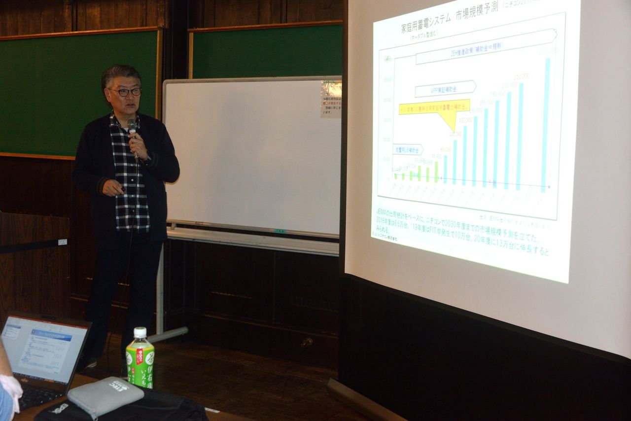 ポイント1「いつも」街乗りは、太陽光発電で、ポイント2「もしも」の停電時も電気を使えるから安心、ポイント3:あなたの暮らしに「ずっと寄り添う、ポイント4:作った電気を「無駄なく」つかえる。トライブリッド蓄電システムについて(蓄電池ユニット・増設ユニット・トライブリッドパワコン・室内リモコンV2Hスタンド)、毎日のクルマのエネルギーコストは0円に。単機能蓄電システム「EES-U3S1」2019年1月発売、系統連系型 新型V2Hシステム解発019-5月発売、ZEH,ZEH+補助金、本年度、来年度補助金動向、「補助」から「規制」へ。H31年度当初予算 災害時活用家庭用蓄電システム補助金、についてなど。講演は聴衆の心理をつかみ巧みな話しぶりで、関心を高めていた。